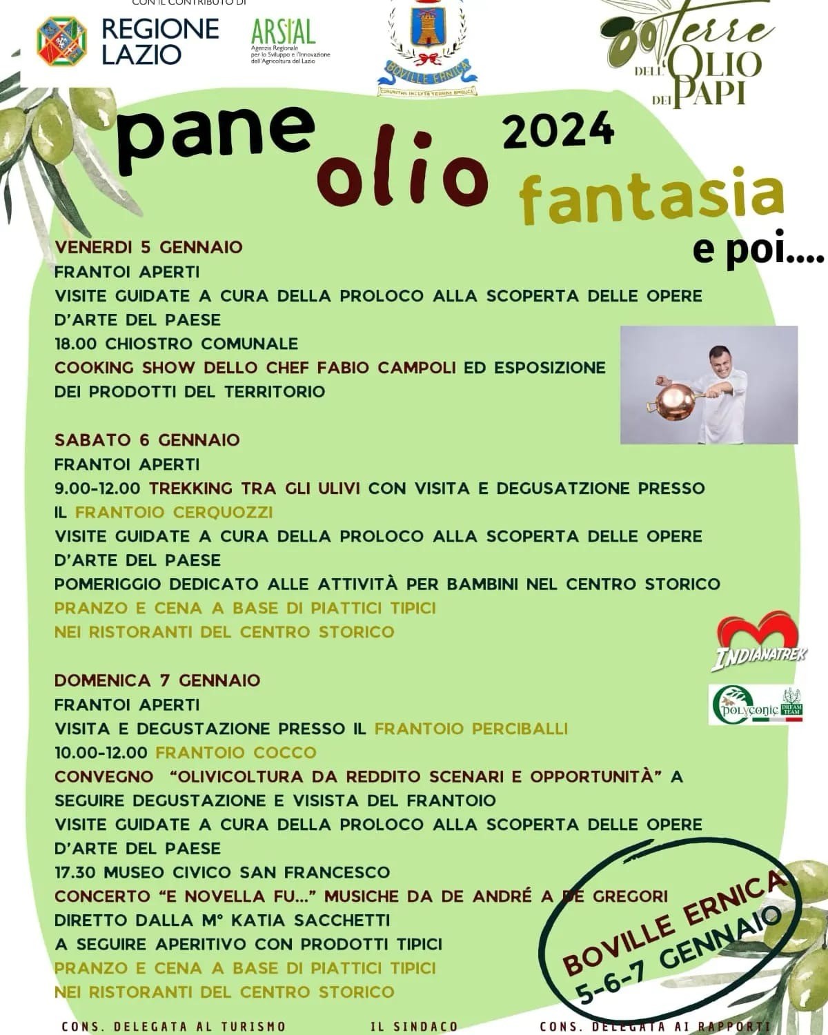 Dal 5 al 7 gennaio 2024 torna Pane Olio e Fantasia a Boville Ernica (FR), la manifestazione dedicata a olio e prodotti tipici del territorio, con ospite lo chef laziale più amato