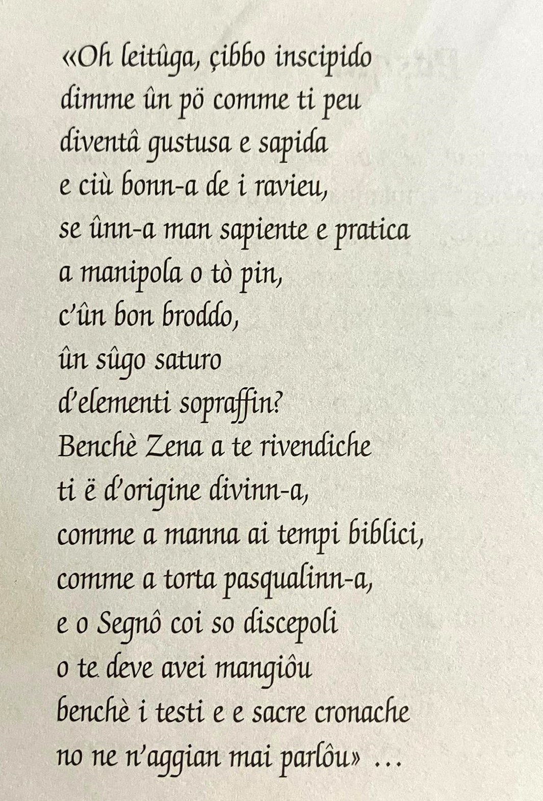Traduzione: Oh lattuga, cibo insipido,/ dimmi un pò come puoi / diventare gustosa e sapida / e migliore dei ravioli,/se una mano sapiente ed esperta/ manipola il tuo ripieno,/ con un buon brodo, un sugo saturo / d'elementi sopraffini?/ Benchè Genova ti rivendichi/ sei d'origine divina,/ come la manna ai tempi biblici,/ come la torta pasqualina,/ e il signore coi suoi discepoli/ deve averti mangiato,/ benché i testi e le sacre cronache/ non ce n'abbian mai parlato"