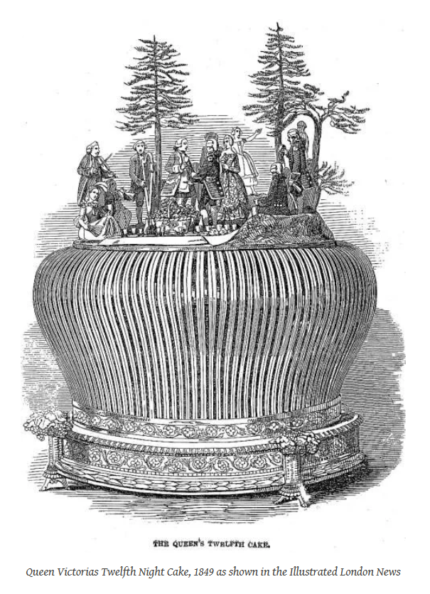 L’Illustrated London News nel 1849 riportò notizia della celebrazione della Dodicesima notte della regina Vittoria e la famiglia reale con una serata a teatro e una fastosa torta. La Twelfth Cake preparata per questa occasione dal pasticciere di corte Mawditt pesava 90 libbre, aveva il diametro di 75 centimetri ed era molto alta: sui lati decorazioni in carta dorata la circondavano innalzandosi verso l’alto, dove 16 figurine rappresentavano un gruppo di giovani uomini e donne in un pasto all’aperto sotto gli alberi, con adulti e bambini danzanti al ritmo delle melodie di un violinista e di un arpista. Perfino i bicchieri, le caraffe e gli accessori da mensa che i servi porgevano ai commensali erano riprodotti con mirabile abilità. (immagine a seguire tratta dal sito https://queenvictoriaroses.co.uk/)