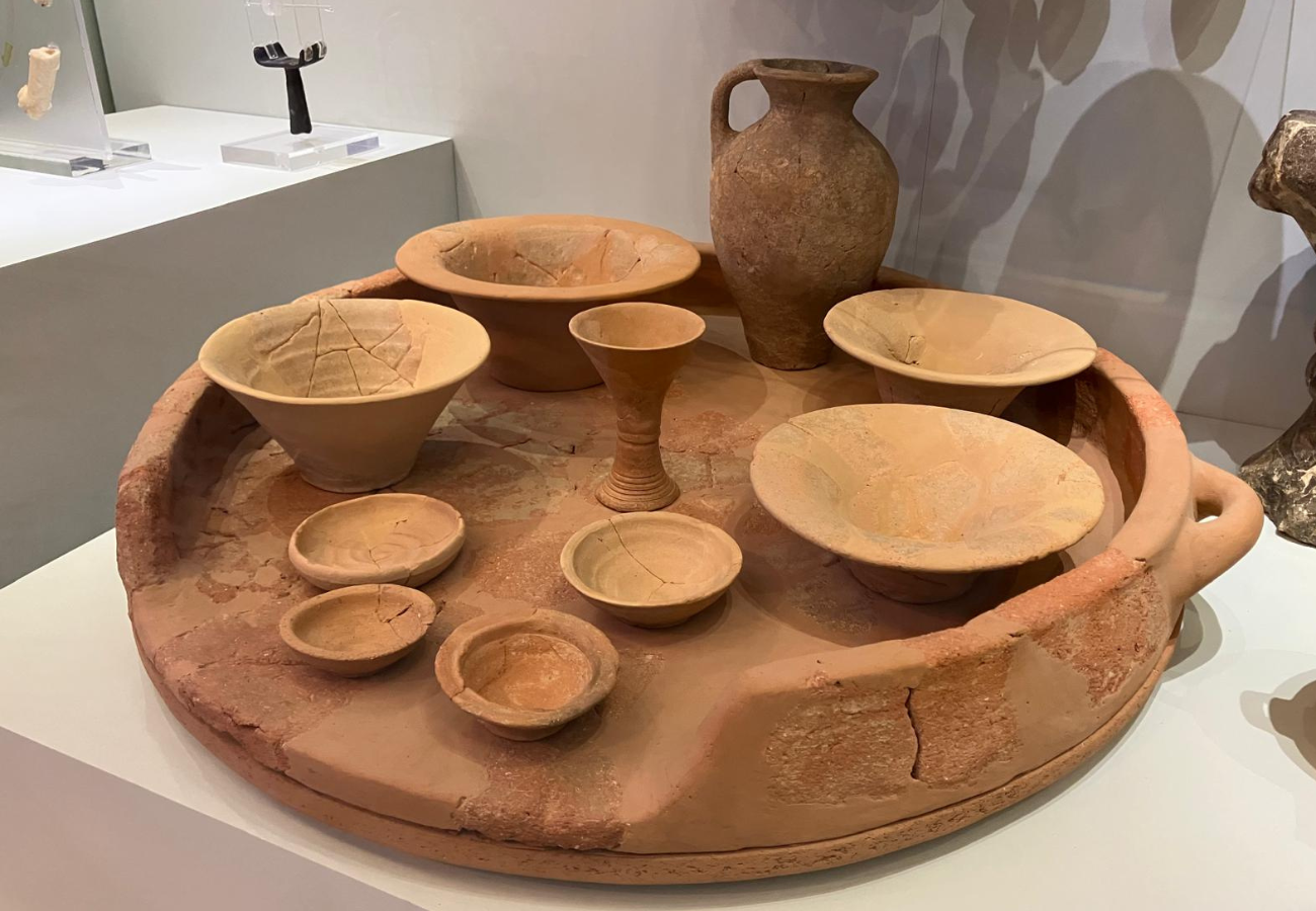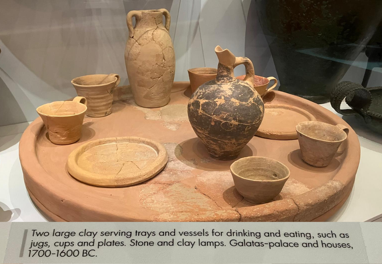 Davanti ai nostri occhi si trovano due grandi vassoi circolari di argilla, accuratamente ricomposti, che fungevano da vere e proprie “tavole portatili”. Sopra di essi, un assortimento di vasellame: brocche per il vino o l’acqua, coppe per bere, piatti per il cibo. Accanto, lampade di pietra e d’argilla, che illuminavano i banchetti nelle case e nel palazzo di Galatas (dove questi reperti sono stati ritrovati), un centro minoico nel cuore di Creta.