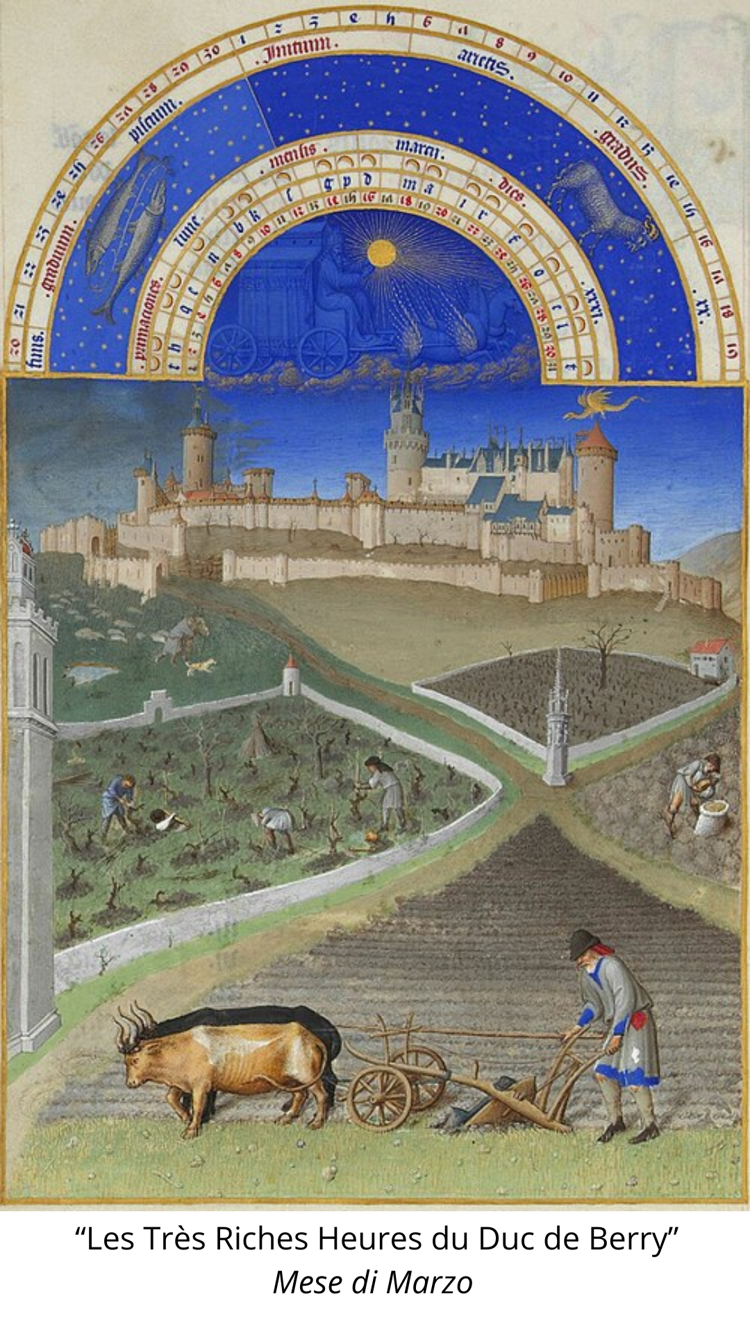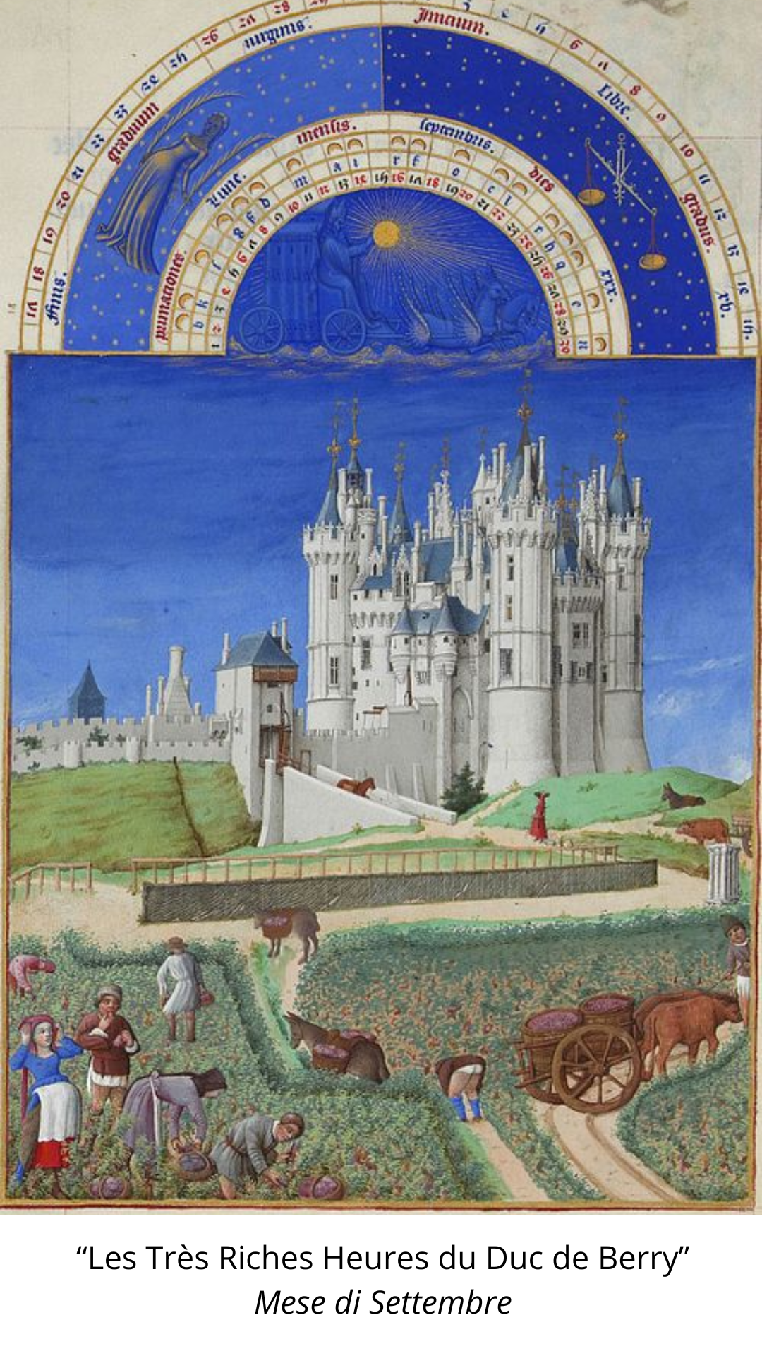 Nel 1405 Paul Limbourg e i suoi due fratelli Herman e Jea, abilissimi miniatori olandesi, furono incaricati dal Duca di eseguire una serie di tre manoscritti l’ultimo dei quali intitolato “Les Très Riches du Duc de Berry” che rappresenta uno dei più grandi capolavori dell’arte della miniatura e del gotico internazionale. Il contenuto del libro è quello di un tipico libro d’ore; esso consta di 206 fogli di pergamena che corrispondono a 412 pagine, 131 miniature in oro e argento e più di 3000 iniziali in oro. Quest’ opera è famosa soprattutto per il suo Calendario e le sue miniature a tutta pagina affiancate a ciascuno dei 12 mesi dell'anno. Ogni foglio del mese presenta in alto una lunetta con al centro il carro del sole e in semicerchi concentrici si trovano le lunghezze dei giorni, la posizione del sole in rapporto alle costellazioni, le fasi lunari, i segni zodiacali. Sotto le lunette, in rettangoli di soli 14 x 22 centimetri, sono ritratte figure di nobili di corte e contadini all’interno di paesaggi fiabeschi mentre sullo sfondo per ciascun mese sono raffigurati i castelli del Duca o di suo nipote il re Filippo IV di Francia e qualche veduta di Parigi. I prati verdi, i cieli tersi, i colori vivaci, esprimono serenità e gioia di vivere mentre alla profusione dell’oro negli abiti dei nobili e allo sfarzo dei castelli si affianca una rappresentazione puntuale e a tratti giocosa delle attività rurali. .