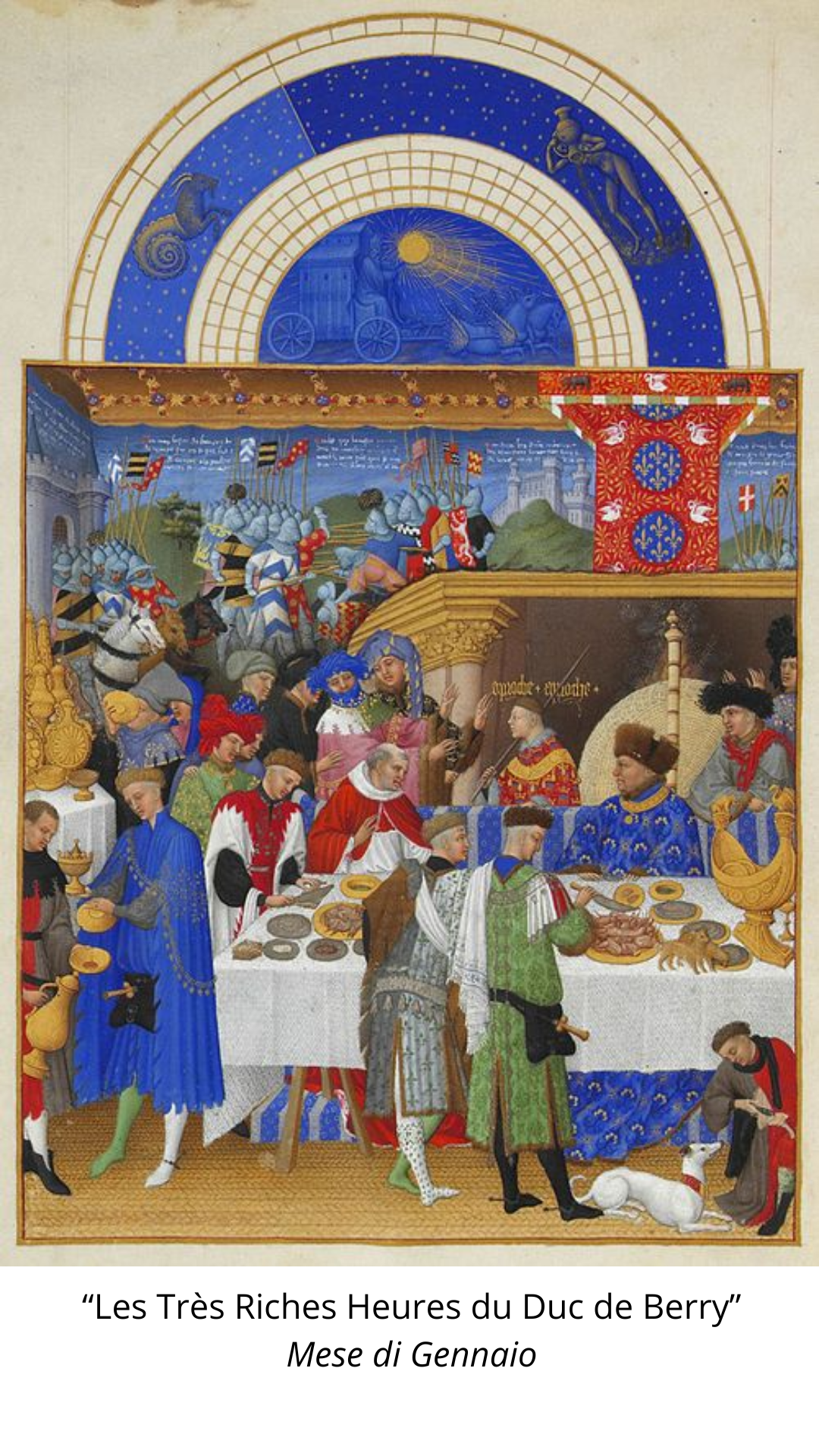 Il Calendario è uno straordinario documento della vita del tempo sia attraverso i dettagli che attraverso le figure umane; i nobili sono ritratti in pose eleganti e composte mentre i contadini intenti nelle loro attività hanno atteggiamenti spontanei e naturali, a volte anche comici. Il mese di Gennaio si apre con un ricco banchetto di nobili tra i quali si riconoscono l’ospite, il Duca di Berry, in abito blu damascato e con un berretto di pelliccia che invita amici e parenti ad avvicinarsi. Sulla tavola imbandita risalta sulla destra un pezzo di oreficeria appartenuta realmente al Duca, una grande saliera a forma di nave che è stata riconosciuta come “le salière du pavillon” dagli inventari di corte del 1413. Febbraio è invece il mese innevato in cui è illustrata la durezza del lavoro contadino; mentre gli uomini si affaccendano all’esterno, nella capanna in primo piano le donne si scaldano al fuoco sollevando poco elegantemente le loro gonne. Nel mese di Marzo domina la scena il lavoro agricolo con l’aratura dei campi mentre in altri appezzamenti si effettua la semina dei cereali, la potatura e la concimazione delle vigne.