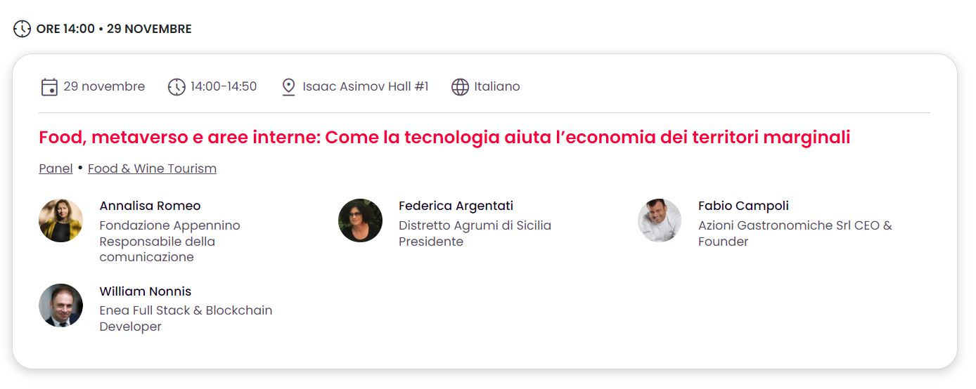 L'evento vedrà l'integrazione delle proposte tradizionali con le innovazioni più avanzate legate alla Realtà Virtuale e a quella Aumentata: il tema centrale di quest’anno sarà proprio il Metatourism. Il Metaverso è infatti il tema del momento, e ciascuno si sta interrongando su come poter interagire con esso in modo utile oltre che ludico: tanti saranno gli incontri dedicati al confronto per immaginare, prevedere, capire se e come agire in merito. Il Metaverso promette di cambiare il rapporto tra i consumatori e le aziende, ma in che modo e con quali conseguenze? Ne parlerà anche Fabio Campoli, che sarà presente martedì 29 novembre alle ore 14.00 nell'ambito della tavola rotonda intitolata "Food, metaverso e aree interne: come la tecnologia aiuta l'economia dei territori marginali", nella quale si porteranno idee a confronto portando anche esempi di giovani case history di successo.