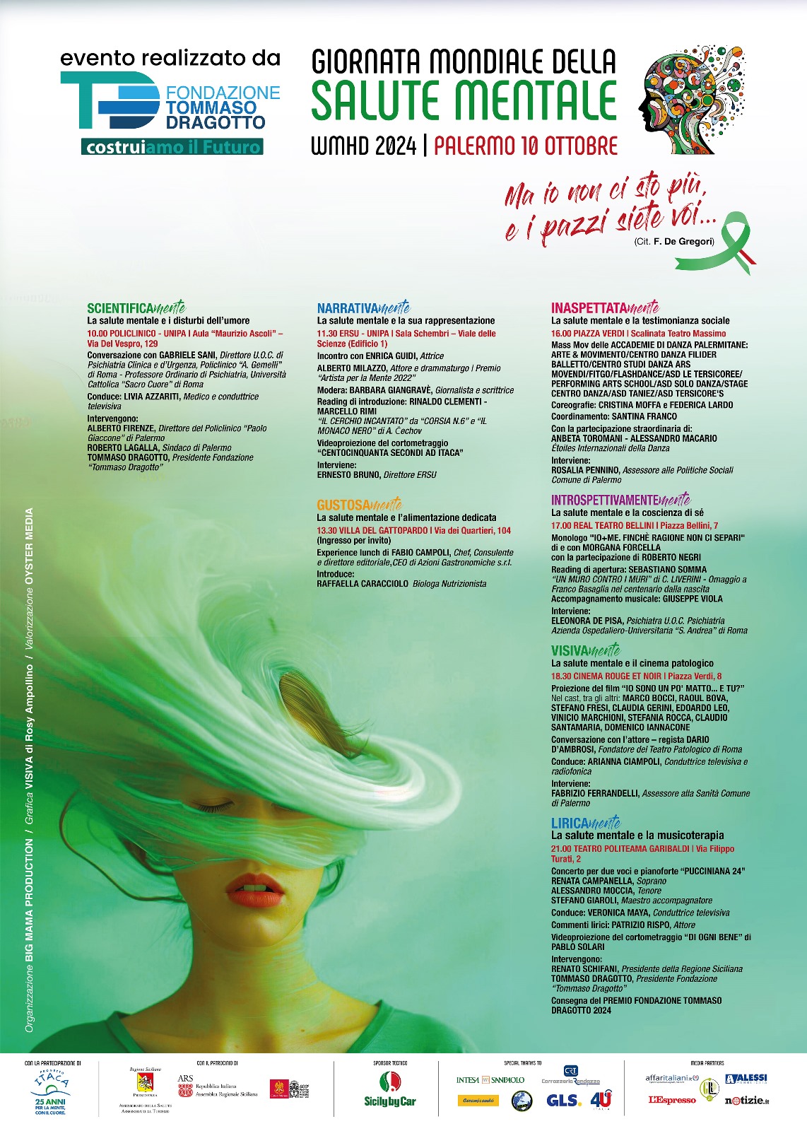 L’organizzazione, a cura Fondazione Dragotto in collaborazione con Progetto Itaca nazionale e Progetto Itaca Palermo, ha scelto di coinvolgere esperti del settore, medici, giornalisti, attori, ballerini e cantanti in una serie di iniziative a sfondo educativo, informativo e culturale. E sarà dato anche giusto spazio al gusto il 10 ottobre 2024 alle 13.30 presso la Villa del Gattopardo (via dei Quartieri 104, Palermo – ingresso su invito), dove Fabio Campoli dedicherà la sua arte culinaria alla salute mentale connessa ad una sana e corretta alimentazione.
