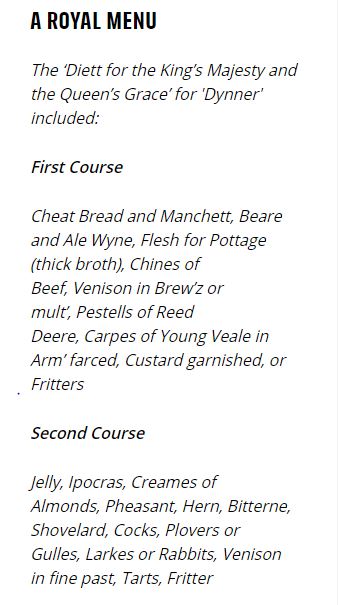 Non di rado Enrico VIII mangiava nelle sue stanze private, lontano dalla folla, nelle occasioni più formali al tavolo coperto dal baldacchino di stato situato nella sua Camera della Presenza. Non di rado la degustazione di piatti salata si mescolava con quelli di natura dolce; ma concludiamo riportando dal sito sopra citato le portate di un menu regale della quotidianità dei Tudor, intitolato "Dieta per la Maestà del Re e la Grazia della Regina". Troverete gelatine, creme dolci, pasticci, frittelle, crostate, fagiani, cervi, conigli, galli, carpe, e per “annaffiare” il tutto l’hypocras, bevanda d’eredità medievale a base di vino, miele e aromi.