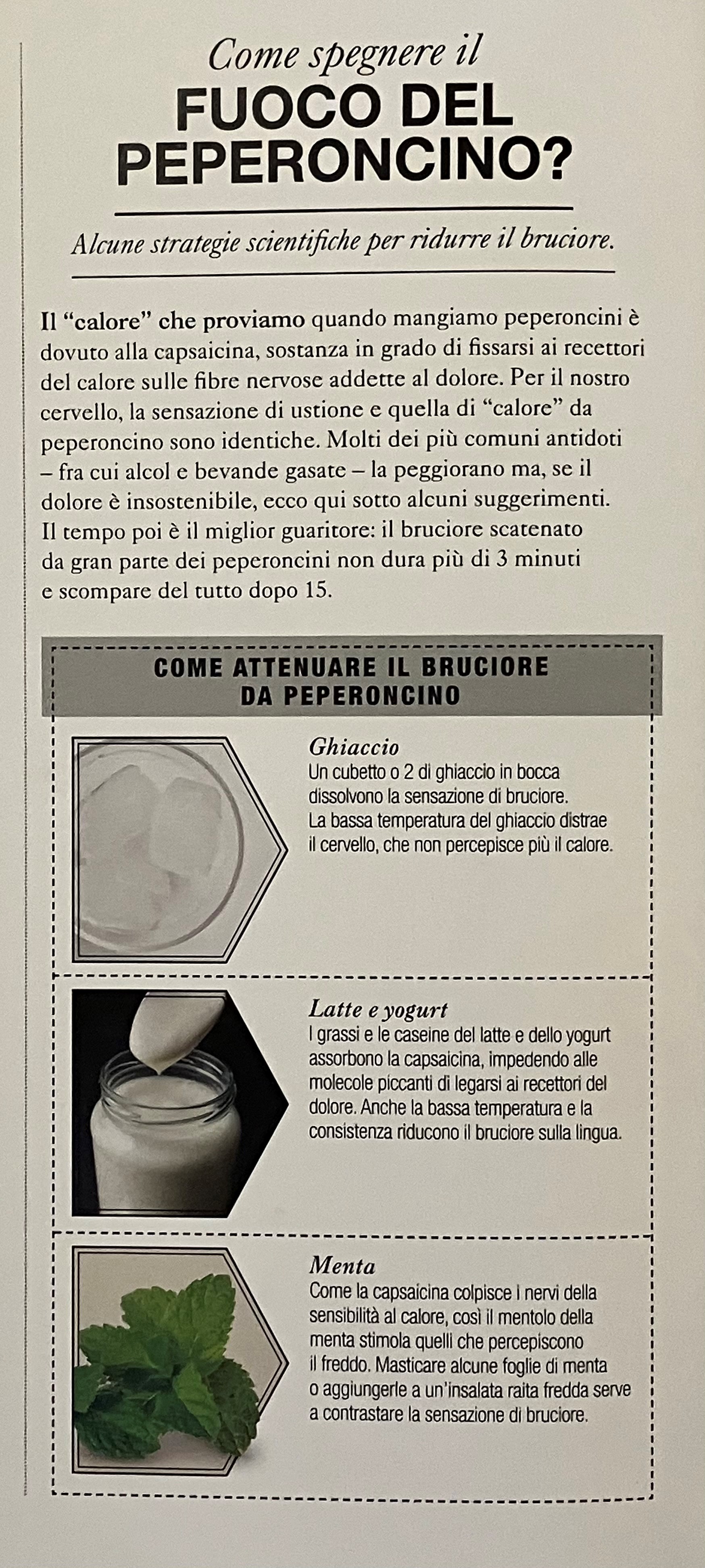 Un libro assolutamente consigliato sia ad esperti che meno esperti di cibo e cucina, per scoprire perchè, curiosità, metodi e persino rimedi, come ad esempio quelli per mitigare la piccantezza in bocca dopo aver assaporato pietanze arricchite con peperoncino. E voi, ne conoscete altri? Raccontateceli nei commenti!