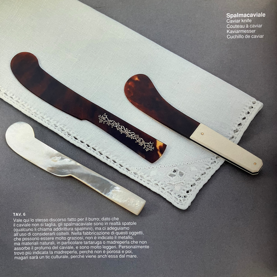 Il caviale è un prodotto estremamente delicato, che deve essere trattato con cura. Tradizionalmente viene servito freddo (ma non congelato) in contenitori non metallici, spesso di vetro, porcellana o madreperla, poiché il metallo può alterarne il sapore. Gli strumenti per servire il caviale, come gli "spalmacaviale" che abbiamo ritrovato illustrati su questo libro ed altri cucchiaini ancora oggi in largo uso, sono tipicamente realizzati in materiali non reattivi, come madreperla, corno, osso. L'impiego di questi materiali non rappresenta dunque un puro vezzo, ma reca in sè una precisa motivazione: l'uso di metalli, in particolare l'argento, viene sconsigliato poiché può ossidare a contatto con il caviale, compromettendone l'aroma.
