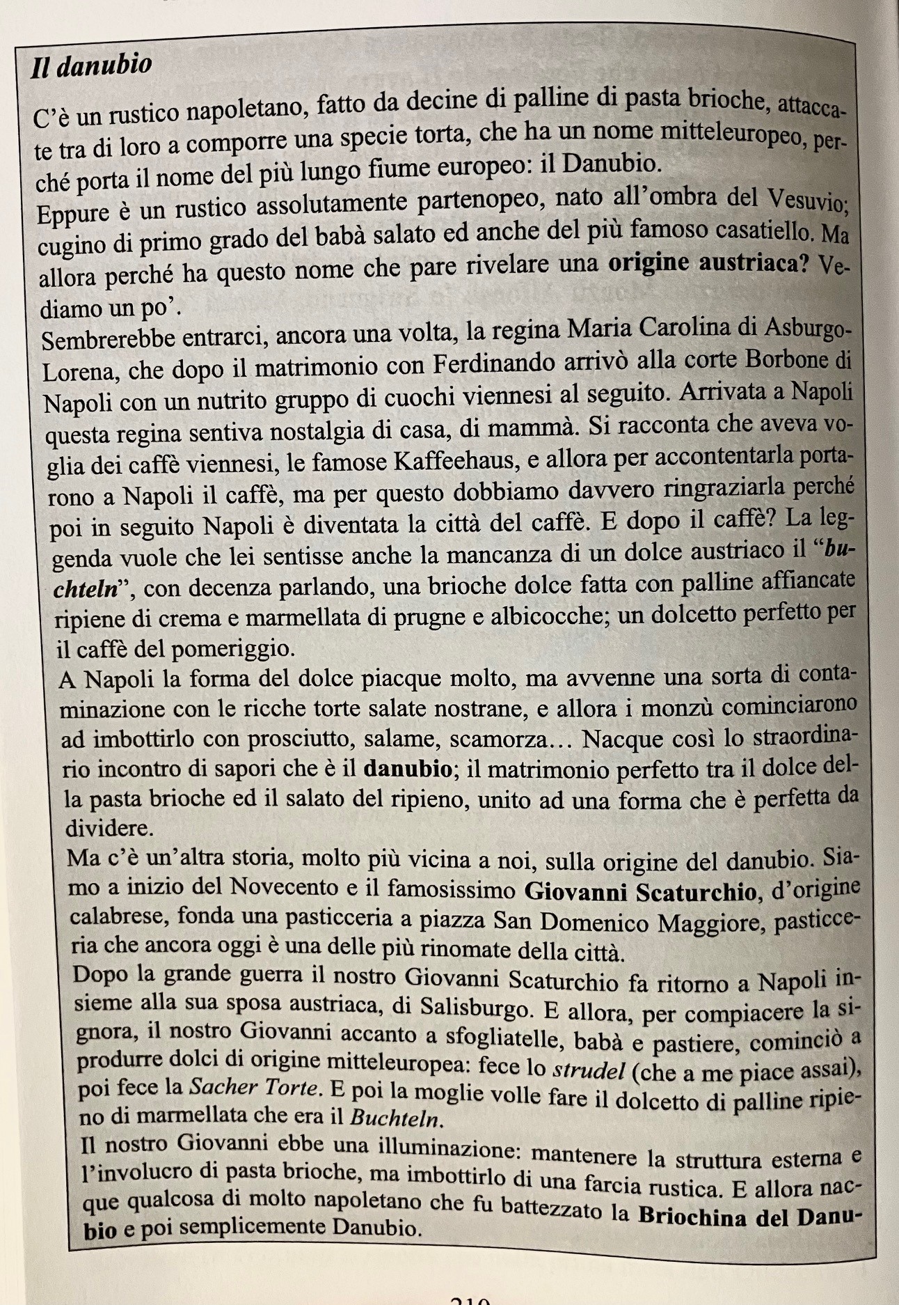 Ancora un volume interessantissimo, questa volta dedicato alla cultura gastronomica napoletana. Ricco di aneddoti, curiosità, approfondimenti su modi di fare e modi di dire della tradizione partenopea, il tutto naturalmente intorno al mondo del cibo e della buona cucina. Un piacevolissimo e goloso viaggio a Napoli tutto da leggere, allietato da inserimenti dialettali, note di folklore, ricette e rivelazioni su di esse. Come ad esempio sul danubio, celebre lievitato da forno che compare tanto sulla tavola di Pasqua in versione salata (dimostrandosi in tutto e per tutto un parente stretto del casatiello) quanto su quella del Carnevale, dove non mancano diverse sue rivisitazioni in versione dolce. A voi scoprire tutta la sua essenza nel ritaglio sopra proposto.