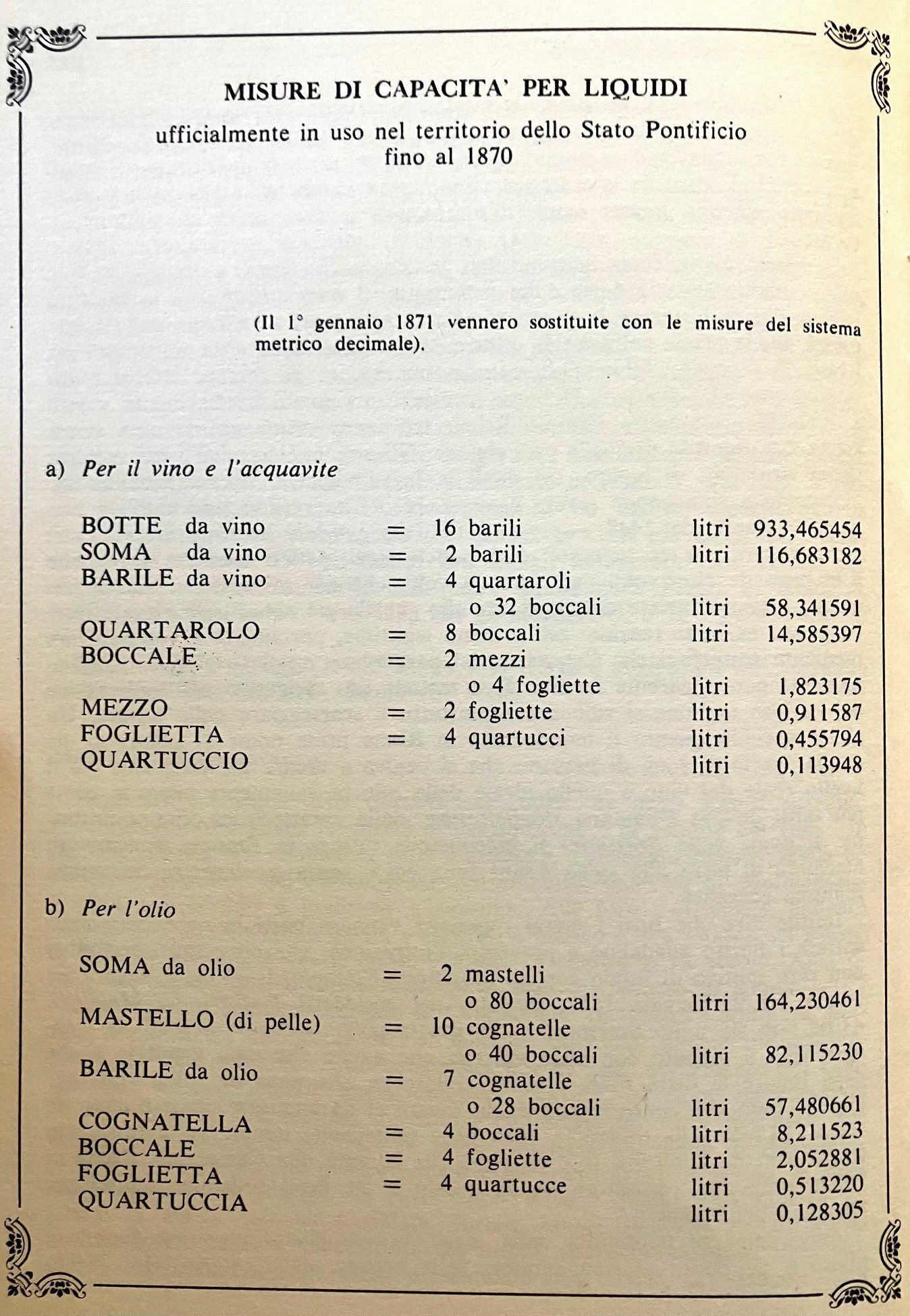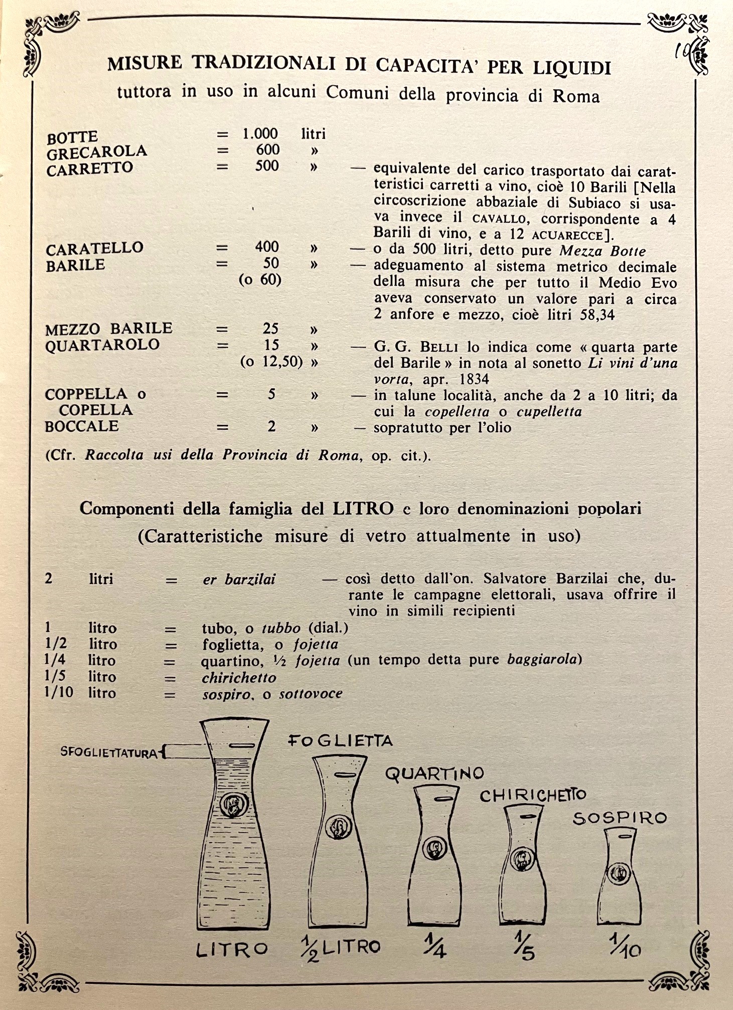 Misure dei liquidi a Roma nel 1870, immagini tratte dal libro "Osterie e feste romane" di Livio Jannattoni, Newton Compton Editore, 1977